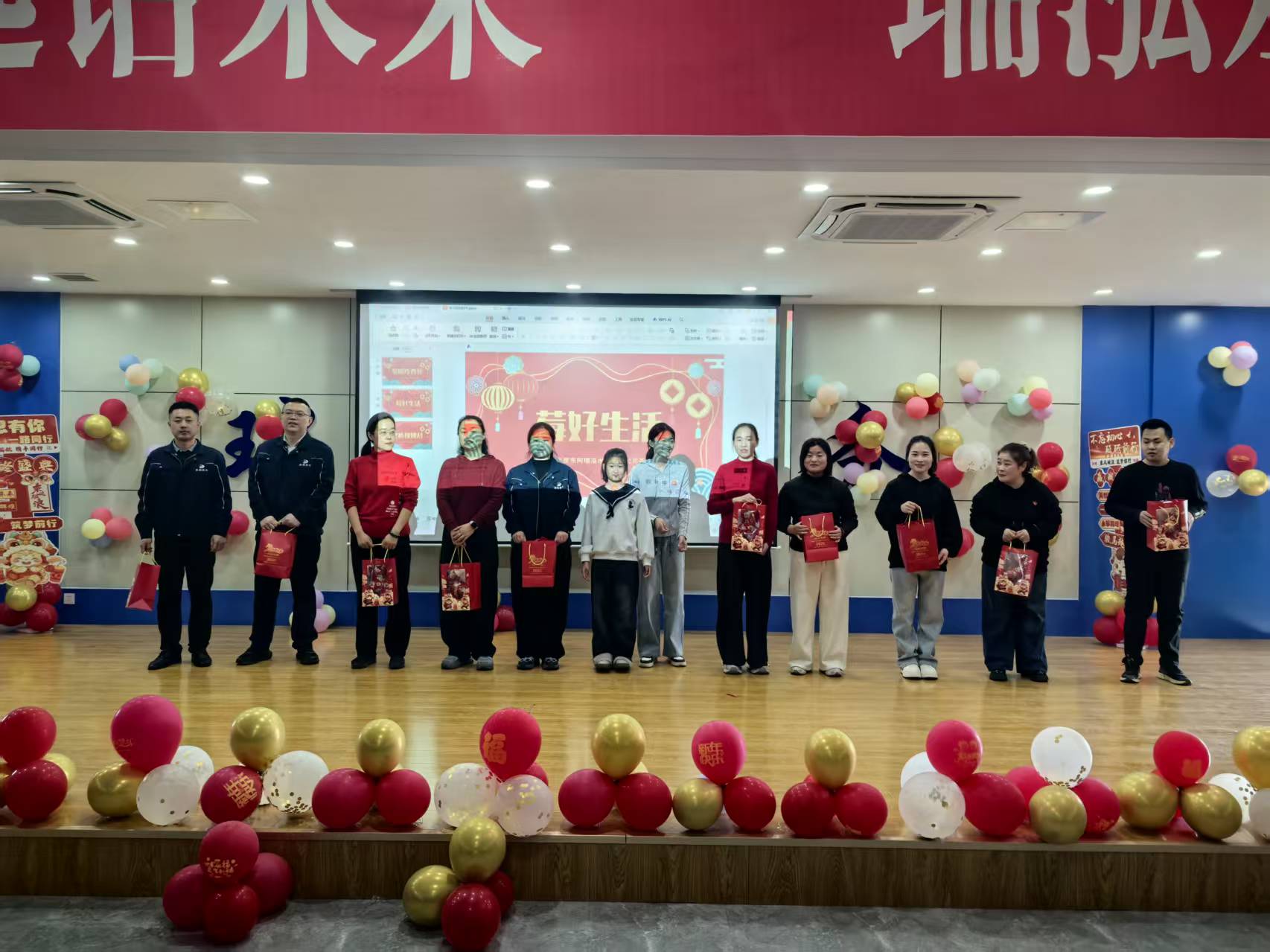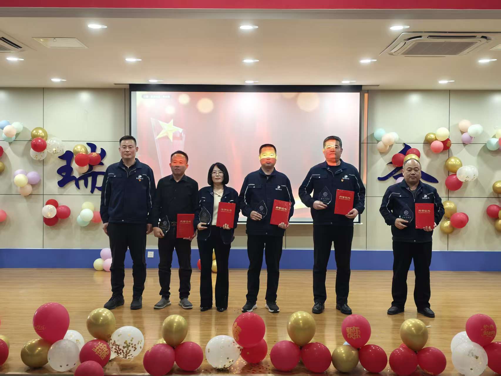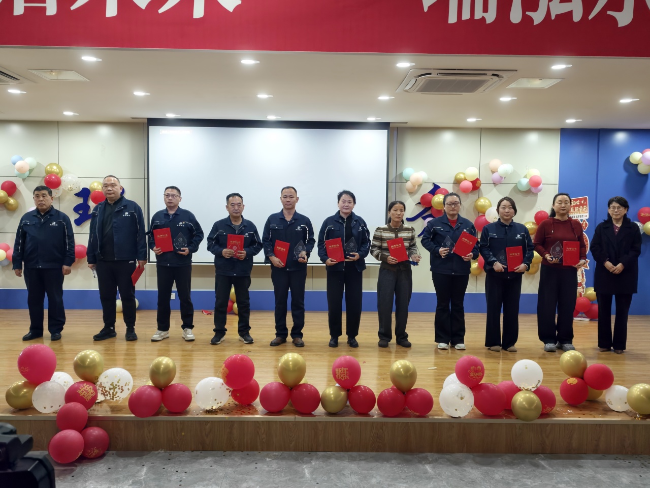 茶话会最庄重暖心的环节,是 2025 年度评优颁奖仪式。公司表彰各岗位脚踏实地、实绩突出的职工,共评选出 21 名先进工作者、6 名先进管理者,公司领导为获奖者颁奖并合影留念。获奖代表依次上台分享工作心得,表达了对公司的感恩之情以及扎根岗位、再创佳绩的坚定决心,为全体职工树立了学习榜样。